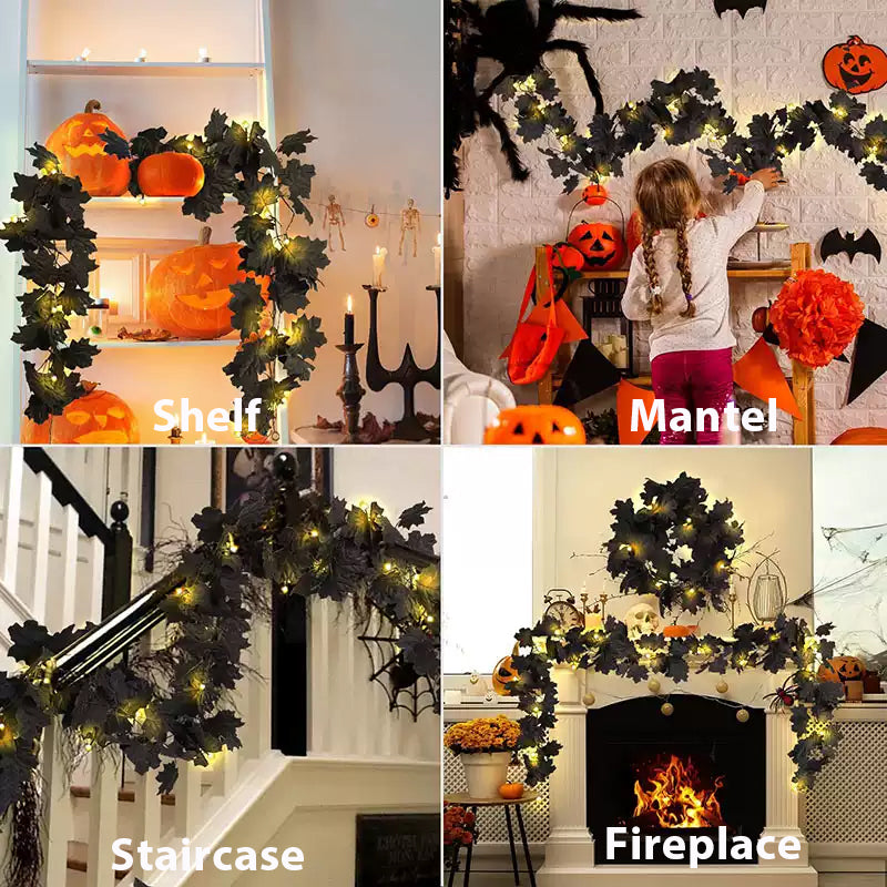 🎃✨ Elevate your Halloween decor with this eerie Black Maple Leaf Garland Light. Perfect for adding a spooky touch to mantels, staircases, and more, its warm LED lights create a hauntingly beautiful glow.
